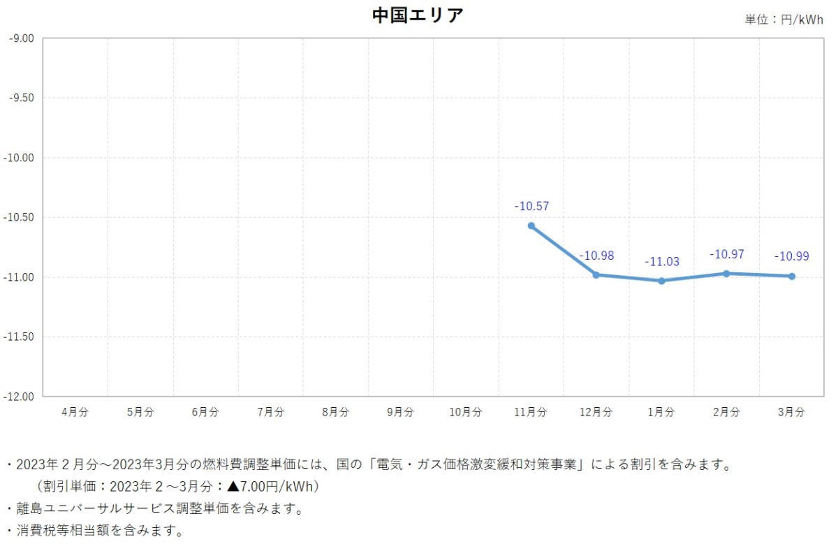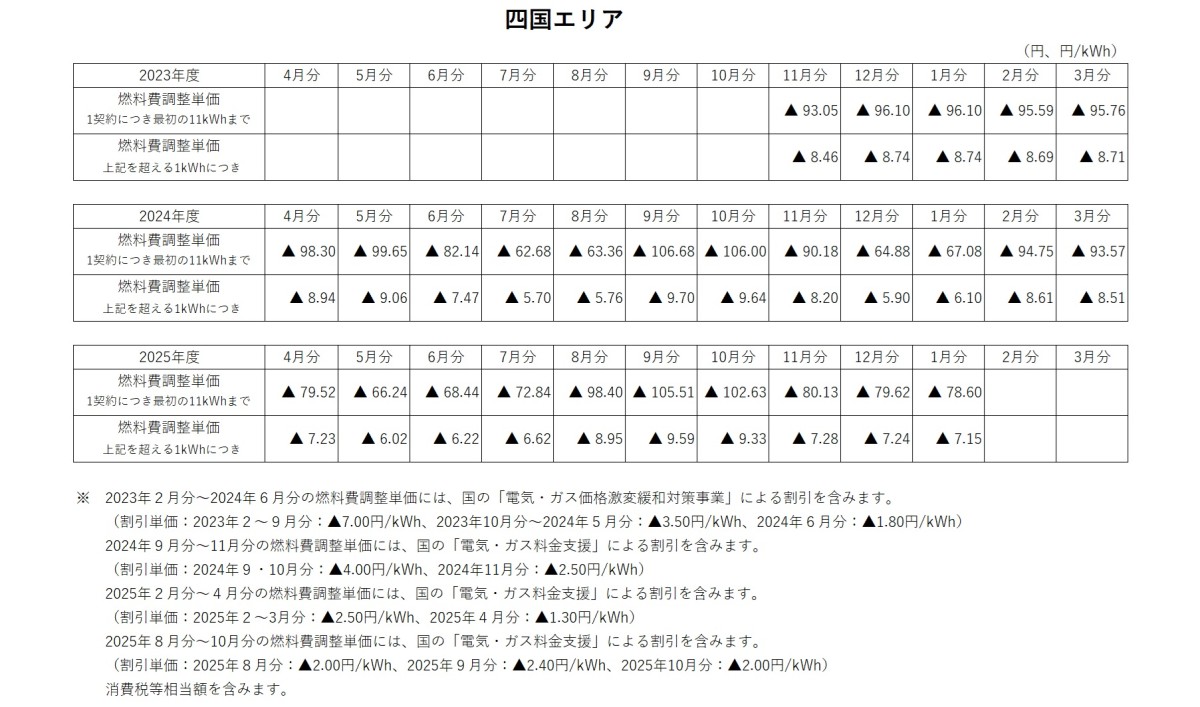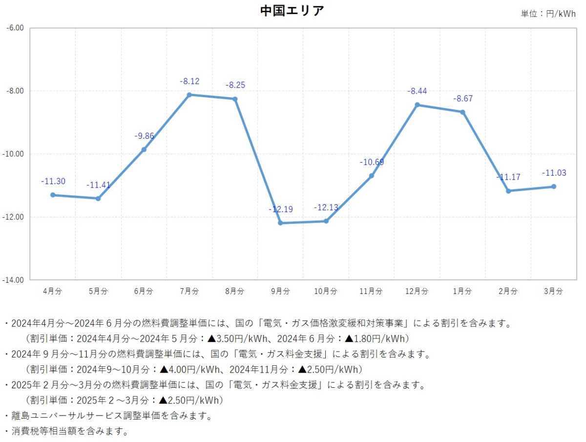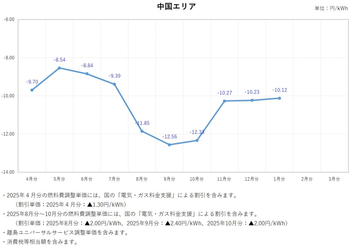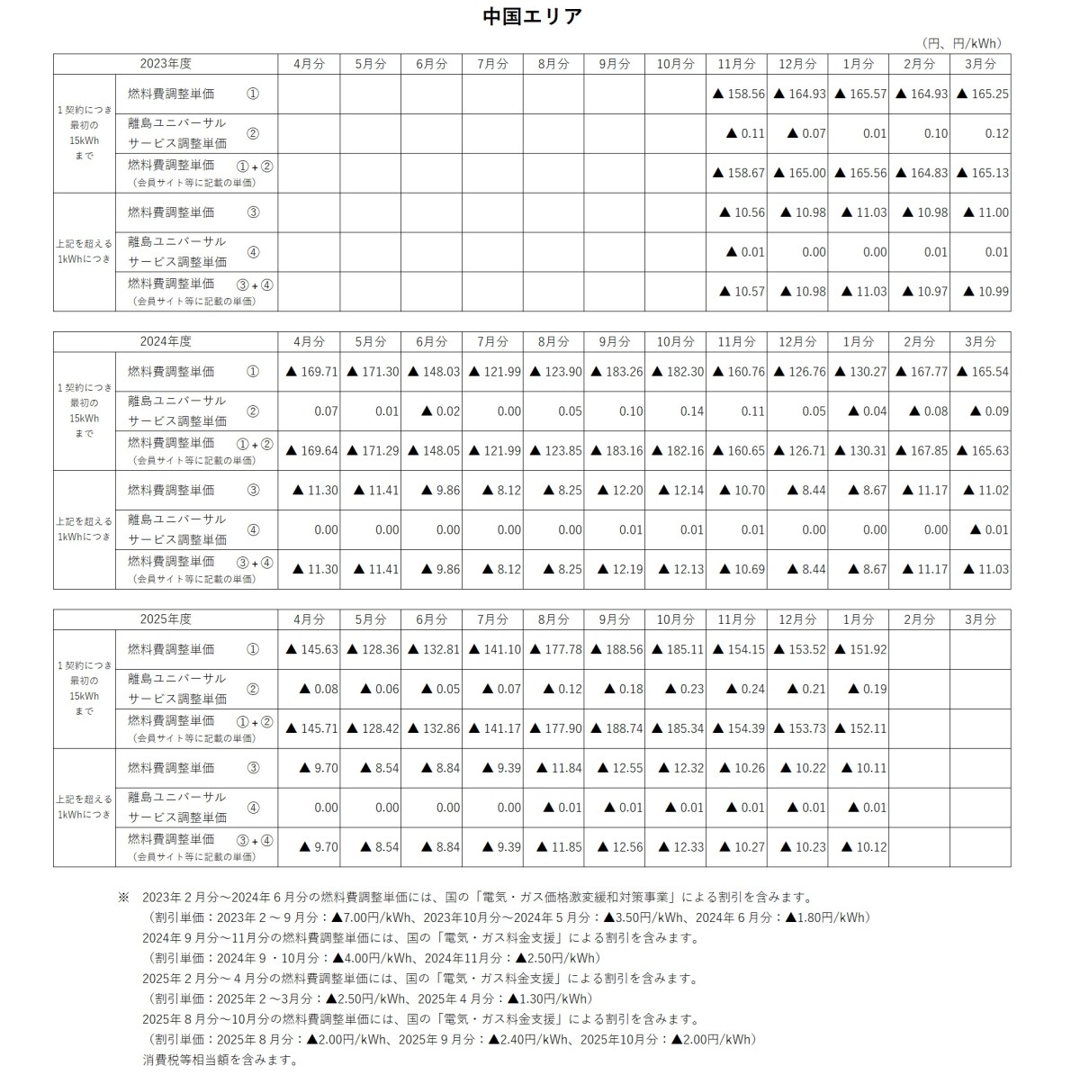 燃料費調整単価について トップ ご家庭のお客さま 燃料費調整単価について 電気料金の燃料費調整単価 燃料費調整単価一覧(表)【低圧】 燃料費調整単価一覧(グラフ:2025年度)【低圧】 北海道エリア 東北エリア 関東エリア 中部エリア 北陸エリア 関西エリア 中国エリア 四国エリア 燃料費調整単価一覧(グラフ:2024年度)【低圧】 北海道エリア 東北エリア 関東エリア 中部エリア 北陸エリア 関西エリア 中国エリア 四国エリア 燃料費調整単価一覧(グラフ:2023年度)【低圧】 北海道エリア 東北エリア 関東エリア 中部エリア 北陸エリア 関西エリア 中国エリア 四国エリア 燃料費調整単価一覧(表)【高圧・特別高圧】 燃料費調整単価一覧(グラフ)【高圧・特別高圧】 関東エリア(高圧) 関東エリア(特別高圧) 関西エリア(高圧) 関西エリア(特別高圧) 中国エリア(高圧) 中国エリア(特別高圧) 2025年度 2026年1月分燃料費調整単価(低圧) 2025年12月分燃料費調整単価(低圧) 2025年11月分燃料費調整単価(低圧) 2025年10月分燃料費調整単価(低圧) 2025年9月分燃料費調整単価(低圧) 2025年8月分燃料費調整単価(低圧) 2025年7月分燃料費調整単価(低圧) 2025年6月分燃料費調整単価(低圧) 2025年5月分燃料費調整単価(低圧) 2025年4月分燃料費調整単価(低圧) 2024年度 2025年3月分燃料費調整単価(低圧) 2025年2月分燃料費調整単価(低圧) 2025年1月分燃料費調整単価(低圧) 2024年12月分燃料費調整単価(低圧) 2024年11月分燃料費調整単価(低圧) 2024年10月分燃料費調整単価(低圧) 2024年9月分燃料費調整単価(低圧) 2024年8月分燃料費調整単価(関東エリア) 2024年8月分燃料費調整単価(低圧) 2024年7月分燃料費調整単価(関東エリア) 2024年7月分燃料費調整単価(低圧) 2024年6月分燃料費調整単価(関東エリア) 2024年6月分燃料費調整単価(低圧) 2024年5月分燃料費調整単価(関東エリア) 2024年5月分燃料費調整単価(関西エリア) 2024年5月分燃料費調整単価(中国エリア) 2024年5月分燃料費調整単価(低圧) 2024年4月分燃料費調整単価(関東エリア) 2024年4月分燃料費調整単価(関西エリア) 2024年4月分燃料費調整単価(中国エリア) 2024年4月分燃料費調整単価(低圧) 2023年度 2024年3月分燃料費調整単価(関東エリア) 2024年3月分燃料費調整単価(関西エリア) 2024年3月分燃料費調整単価(中国エリア) 2024年3月分燃料費調整単価(低圧) 2024年2月分燃料費調整単価(関東エリア) 2024年2月分燃料費調整単価(関西エリア) 2024年2月分燃料費調整単価(中国エリア) 2024年2月分燃料費調整単価(低圧) 2024年1月分燃料費調整単価(関東エリア) 2024年1月分燃料費調整単価(関西エリア) 2024年1月分燃料費調整単価(中国エリア) 2024年1月分燃料費調整単価(低圧) 2023年12月分燃料費調整単価(関東エリア) 2023年12月分燃料費調整単価(関西エリア) 2023年12月分燃料費調整単価(中国エリア) 2023年12月分燃料費調整単価(低圧) 2023年11月分燃料費調整単価(関東エリア) 2023年11月分燃料費調整単価(関西エリア) 2023年11月分燃料費調整単価(中国エリア) 2023年11月分燃料費調整単価(低圧) 2023年10月分燃料費調整単価(関東エリア) 2023年10月分燃料費調整単価(関西エリア) 2023年10月分燃料費調整単価(中国エリア) 2023年10月分燃料費調整単価(低圧) 2023年9月分燃料費調整単価(関東エリア) 2023年9月分燃料費調整単価(関西エリア) 2023年9月分燃料費調整単価(中国エリア) 2023年8月分燃料費調整単価(関東エリア) 2023年8月分燃料費調整単価(関西エリア) 2023年8月分燃料費調整単価(中国エリア) 2023年7月分燃料費調整単価(関東エリア) 2023年7月分燃料費調整単価(関西エリア) 2023年7月分燃料費調整単価(中国エリア) 2023年6月分燃料費調整単価(関東エリア) 2023年6月分燃料費調整単価(関西エリア) 2023年6月分燃料費調整単価(中国エリア) 2023年5月分燃料費調整単価(関東エリア) 2023年5月分燃料費調整単価(関西エリア) 2023年5月分燃料費調整単価(中国エリア) 2023年4月分燃料費調整単価(関東エリア) 2023年4月分燃料費調整単価(関西エリア) 2023年4月分燃料費調整単価(中国エリア) 2022年度 2023年3月分燃料費調整単価(関東エリア) 2023年3月分燃料費調整単価(関西エリア) 2023年2月分燃料費調整単価(関東エリア) 2023年2月分燃料費調整単価(関西エリア) 2023年1月分燃料費調整単価(関東エリア) 2023年1月分燃料費調整単価(関西エリア) 2022年12月分燃料費調整単価(関東エリア) 2022年12月分燃料費調整単価(関西エリア) 2022年11月分燃料費調整単価(関東エリア) 2022年11月分燃料費調整単価(関西エリア) 2022年10月分燃料費調整単価(関東エリア) 2022年10月分燃料費調整単価(関西エリア) 2022年9月分燃料費調整単価(関東エリア) 2022年9月分燃料費調整単価(関西エリア) 2022年8月分燃料費調整単価(関東エリア) 2022年8月分燃料費調整単価(関西エリア) 2022年7月分燃料費調整単価(関東エリア) 2022年7月分燃料費調整単価(関西エリア) 2022年6月分燃料費調整単価(関東エリア) 2022年6月分燃料費調整単価(関西エリア) 2022年5月分燃料費調整単価(関東エリア) 2022年5月分燃料費調整単価(関西エリア) 2022年4月分燃料費調整単価(関東エリア) 2022年4月分燃料費調整単価(関西
