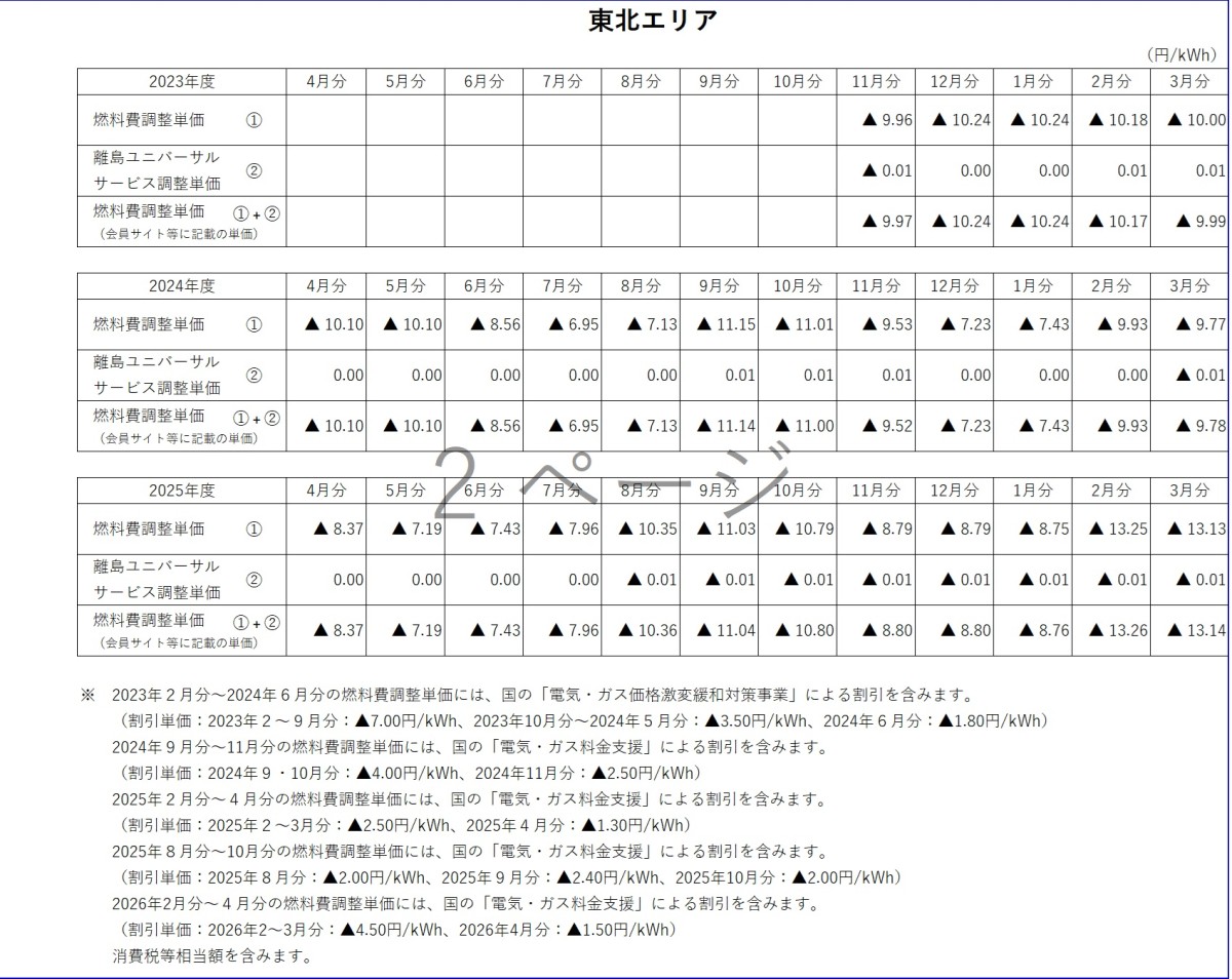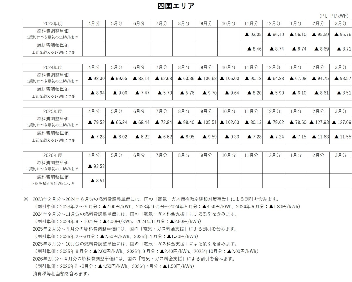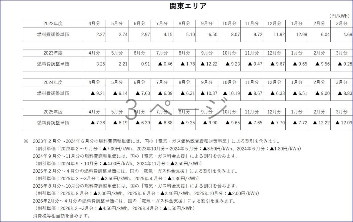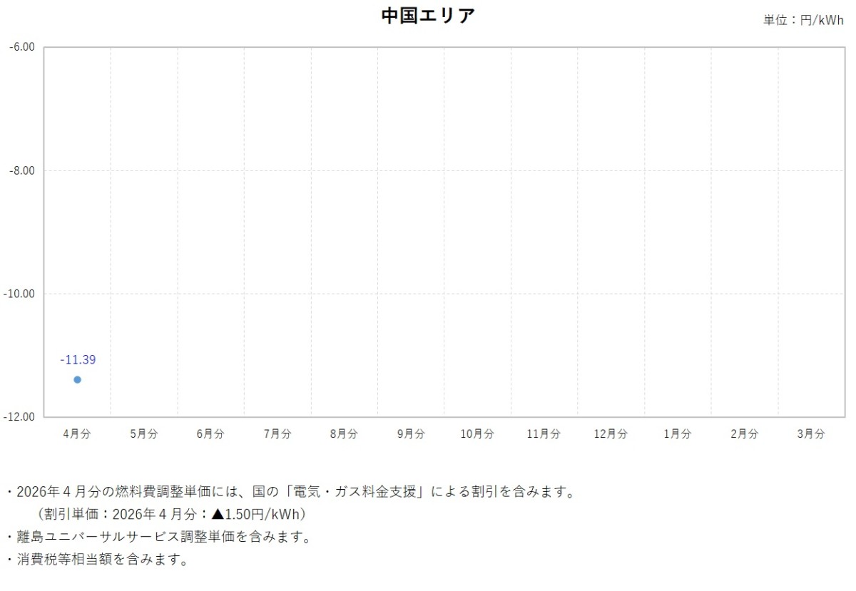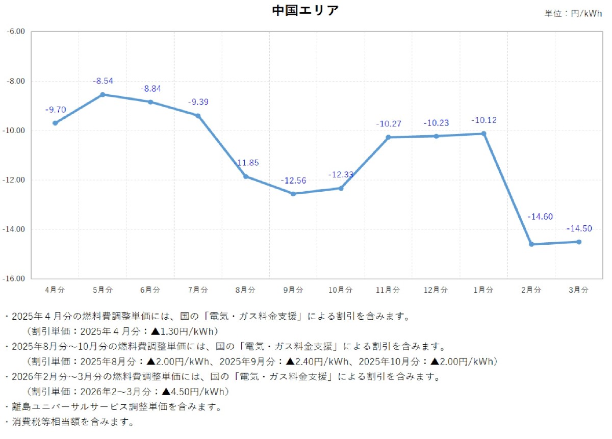 燃料費調整単価について トップ ご家庭のお客さま 燃料費調整単価について 電気料金の燃料費調整単価 燃料費調整単価一覧(表)【低圧】 燃料費調整単価一覧(グラフ:2025年度)【低圧】 北海道エリア 東北エリア 関東エリア 中部エリア 北陸エリア 関西エリア 中国エリア 四国エリア 燃料費調整単価一覧(グラフ:2024年度)【低圧】 北海道エリア 東北エリア 関東エリア 中部エリア 北陸エリア 関西エリア 中国エリア 四国エリア 燃料費調整単価一覧(グラフ:2023年度)【低圧】 北海道エリア 東北エリア 関東エリア 中部エリア 北陸エリア 関西エリア 中国エリア 四国エリア 燃料費調整単価一覧(表)【高圧・特別高圧】 燃料費調整単価一覧(グラフ)【高圧・特別高圧】 関東エリア(高圧) 関東エリア(特別高圧) 関西エリア(高圧) 関西エリア(特別高圧) 中国エリア(高圧) 中国エリア(特別高圧) 2025年度 2026年3月分燃料費調整単価(低圧) 2026年2月分燃料費調整単価(低圧) 2026年1月分燃料費調整単価(低圧) 2025年12月分燃料費調整単価(低圧) 2025年11月分燃料費調整単価(低圧) 2025年10月分燃料費調整単価(低圧) 2025年9月分燃料費調整単価(低圧) 2025年8月分燃料費調整単価(低圧) 2025年7月分燃料費調整単価(低圧) 2025年6月分燃料費調整単価(低圧) 2025年5月分燃料費調整単価(低圧) 2025年4月分燃料費調整単価(低圧) 2024年度 2025年3月分燃料費調整単価(低圧) 2025年2月分燃料費調整単価(低圧) 2025年1月分燃料費調整単価(低圧) 2024年12月分燃料費調整単価(低圧) 2024年11月分燃料費調整単価(低圧) 2024年10月分燃料費調整単価(低圧) 2024年9月分燃料費調整単価(低圧) 2024年8月分燃料費調整単価(関東エリア) 2024年8月分燃料費調整単価(低圧) 2024年7月分燃料費調整単価(関東エリア) 2024年7月分燃料費調整単価(低圧) 2024年6月分燃料費調整単価(関東エリア) 2024年6月分燃料費調整単価(低圧) 2024年5月分燃料費調整単価(関東エリア) 2024年5月分燃料費調整単価(関西エリア) 2024年5月分燃料費調整単価(中国エリア) 2024年5月分燃料費調整単価(低圧) 2024年4月分燃料費調整単価(関東エリア) 2024年4月分燃料費調整単価(関西エリア) 2024年4月分燃料費調整単価(中国エリア) 2024年4月分燃料費調整単価(低圧) 2023年度 2024年3月分燃料費調整単価(関東エリア) 2024年3月分燃料費調整単価(関西エリア) 2024年3月分燃料費調整単価(中国エリア) 2024年3月分燃料費調整単価(低圧) 2024年2月分燃料費調整単価(関東エリア) 2024年2月分燃料費調整単価(関西エリア) 2024年2月分燃料費調整単価(中国エリア) 2024年2月分燃料費調整単価(低圧) 2024年1月分燃料費調整単価(関東エリア) 2024年1月分燃料費調整単価(関西エリア) 2024年1月分燃料費調整単価(中国エリア) 2024年1月分燃料費調整単価(低圧) 2023年12月分燃料費調整単価(関東エリア) 2023年12月分燃料費調整単価(関西エリア) 2023年12月分燃料費調整単価(中国エリア) 2023年12月分燃料費調整単価(低圧) 2023年11月分燃料費調整単価(関東エリア) 2023年11月分燃料費調整単価(関西エリア) 2023年11月分燃料費調整単価(中国エリア) 2023年11月分燃料費調整単価(低圧) 2023年10月分燃料費調整単価(関東エリア) 2023年10月分燃料費調整単価(関西エリア) 2023年10月分燃料費調整単価(中国エリア) 2023年10月分燃料費調整単価(低圧) 2023年9月分燃料費調整単価(関東エリア) 2023年9月分燃料費調整単価(関西エリア) 2023年9月分燃料費調整単価(中国エリア) 2023年8月分燃料費調整単価(関東エリア) 2023年8月分燃料費調整単価(関西エリア) 2023年8月分燃料費調整単価(中国エリア) 2023年7月分燃料費調整単価(関東エリア) 2023年7月分燃料費調整単価(関西エリア) 2023年7月分燃料費調整単価(中国エリア) 2023年6月分燃料費調整単価(関東エリア) 2023年6月分燃料費調整単価(関西エリア) 2023年6月分燃料費調整単価(中国エリア) 2023年5月分燃料費調整単価(関東エリア) 2023年5月分燃料費調整単価(関西エリア) 2023年5月分燃料費調整単価(中国エリア) 2023年4月分燃料費調整単価(関東エリア) 2023年4月分燃料費調整単価(関西エリア) 2023年4月分燃料費調整単価(中国エリア) 2022年度 2023年3月分燃料費調整単価(関東エリア) 2023年3月分燃料費調整単価(関西エリア) 2023年2月分燃料費調整単価(関東エリア) 2023年2月分燃料費調整単価(関西エリア) 2023年1月分燃料費調整単価(関東エリア) 2023年1月分燃料費調整単価(関西エリア) 2022年12月分燃料費調整単価(関東エリア) 2022年12月分燃料費調整単価(関西エリア) 2022年11月分燃料費調整単価(関東エリア) 2022年11月分燃料費調整単価(関西エリア) 2022年10月分燃料費調整単価(関東エリア) 2022年10月分燃料費調整単価(関西エリア) 2022年9月分燃料費調整単価(関東エリア) 2022年9月分燃料費調整単価(関西エリア) 2022年8月分燃料費調整単価(関東エリア) 2022年8月分燃料費調整単価(関西エリア) 2022年7月分燃料費調整単価(関東エリア) 2022年7月分燃料費調整単価(関西エリア) 2022年6月分燃料費調整単価(関東エリア) 2022年6月分燃料費調整単価(関西エリア) 2022年5月分燃料費調整単価(関東エリア) 2022年5月分燃料費調整単価(関西エリア) 2022年4
