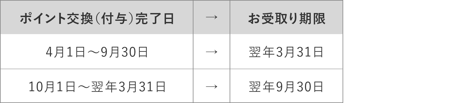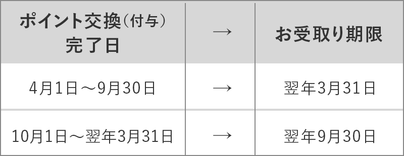 WAONステーションでお受取りいただく電子マネー(WAON)には、お受取り期限があり、この期限を過ぎると失効となります。下記の表の通り、ポイント交換日により、お受取り期限が異なりますので、ご注意ください。