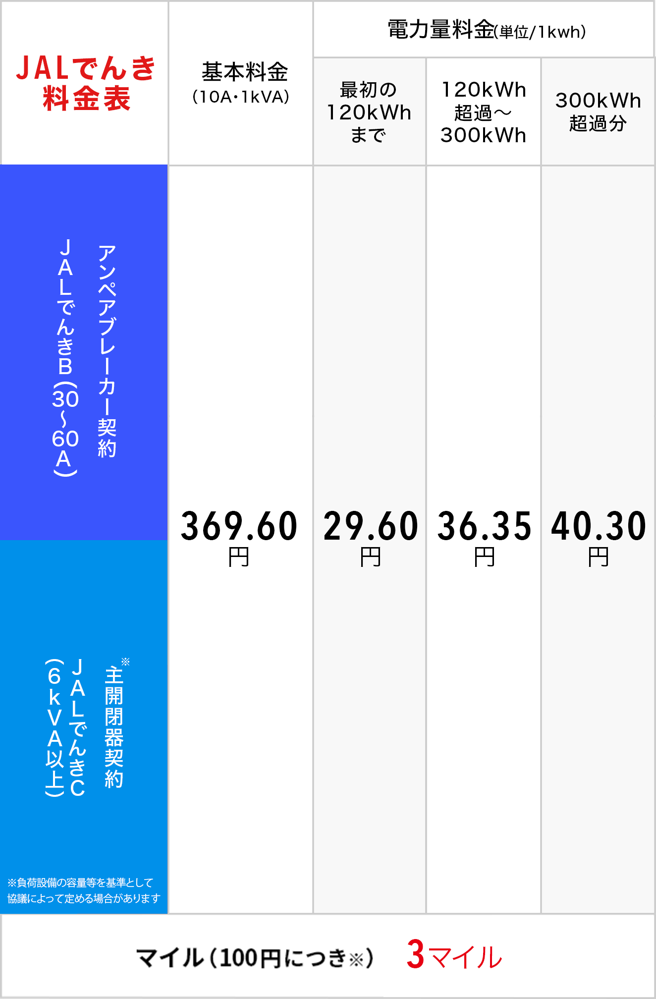 JALでんきB(30~60A アンペアブレーカー契約) JALでんきC(6kVA~ 主開閉器契約※) ※負荷設備の容量等を基準として協議によって定める場合があります。 |